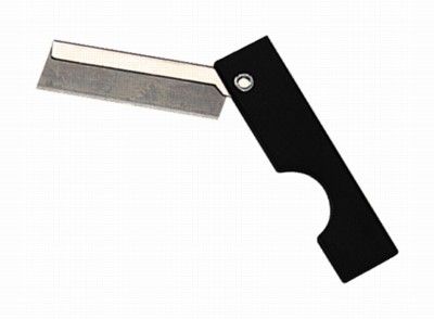 Sharp razor blade with practical protective holder for safe transport and storage.
