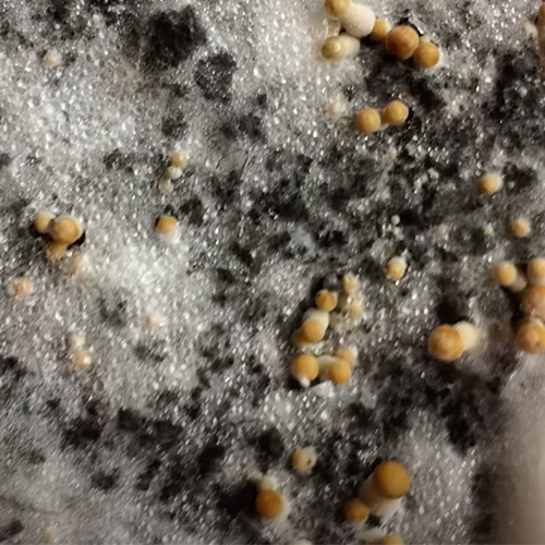 7. After about 7 days, small mushrooms will begin to form. It is important to stop spraying the mycelium box from this point and only spray the inside of the bag. so remove the mycelium box, spray the inside of the bag and place the mycelium box back in the bag.