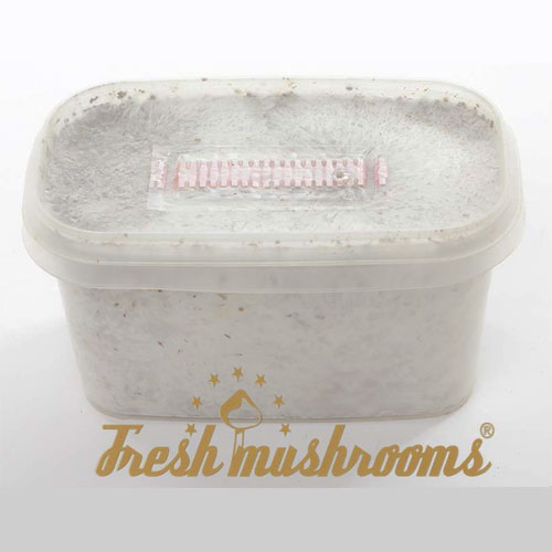 The Cambodia mycelium is colonized on a substrate of rye and perlite. The top layer is covered with vermiculite.